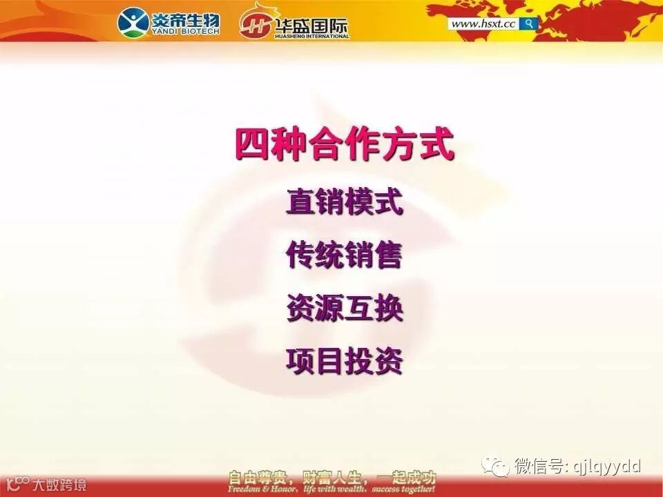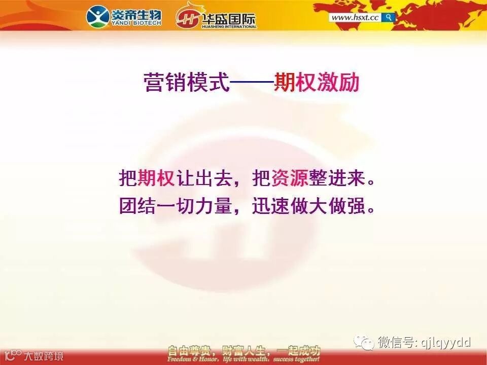 第三种方式,是资源的互换。假设你是个企业家,手下有1000个员工,你只需发一次福利就是66.8万,发一次福利就可以获得10000的分红期权,因为凡是一次性订购66.8万的目前都可以直接获得10000的分红期权。本来发福利是个花钱的事情,现在竟然变成了赚钱的事情,发一次福利就可以永远地分享全国市场的红利,这样的福利你发不发呢?