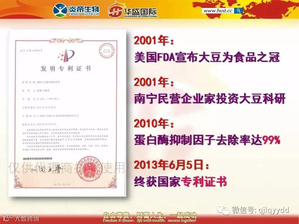 她从2001年开始投资攻关,一直到2010年才获得重大突破。人类首次实现了将大豆里面最难去除的一种成分——蛋白酶抑制因子去除率达到99%,随后就开始申请国家专利,2013年的6月5号正式拿到专利证书。