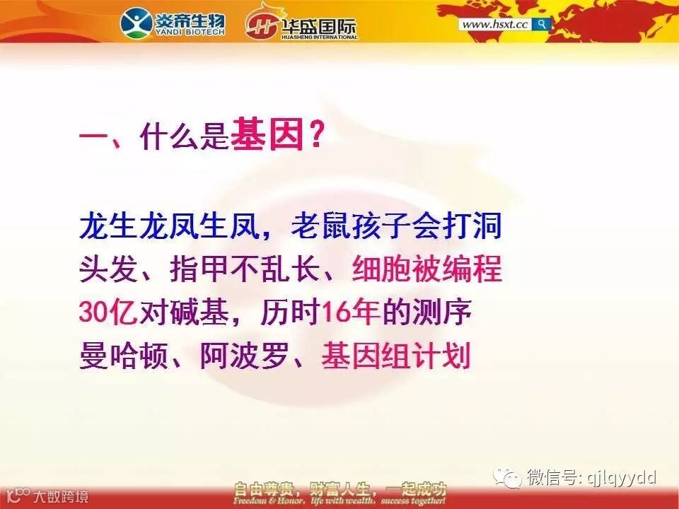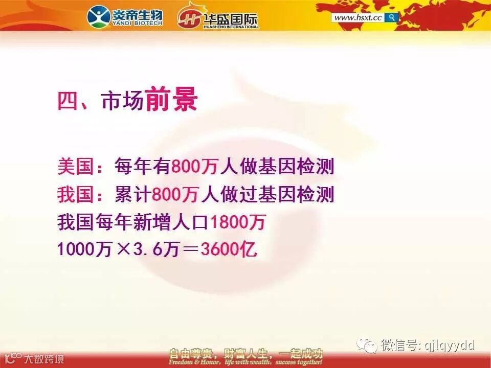 美国人现在每年至少有800万人做基因检测,而我们国家累计做过基因检测的人还不足800万人,巨大的差距蕴藏着巨大的商机,美国人的今天就是中国人的明天,未来我们每年至少会有2000万人做基因检测,高达5000个亿的市场份额,即使我们拥有10%一年也有500个亿,拿出10%的利润来给大家分也有50个亿。请问这么巨大的市场我们不做有没有人来做呢?答案是肯定的。我们每天早晨八点上班晚上五点下班,朝八晚五辛辛苦苦地,为什么呢?还不是为了赚钱吗?最好能够一劳永逸。假设这里就有这样的事情那你还用得着再东找西找的吗?