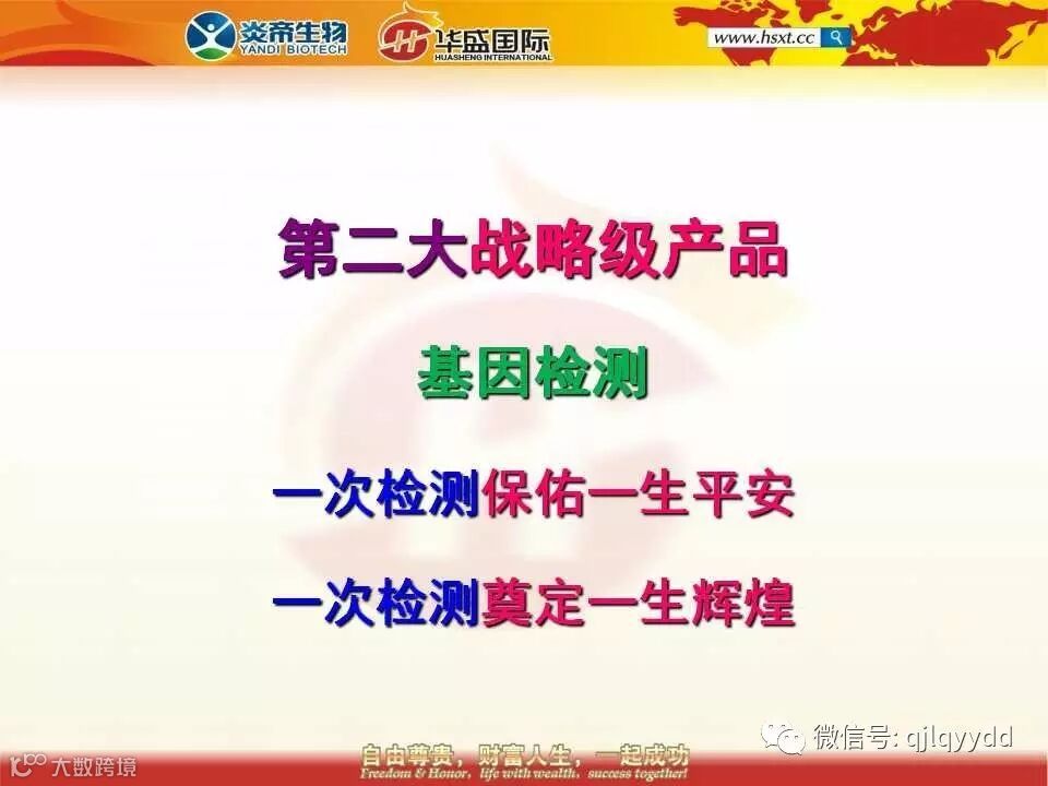 31、接下来我要给大家介绍第二款战略级的产品,叫基因检测。我们的口号是一次检测保佑一生平安;一次检测铸就一生辉煌。