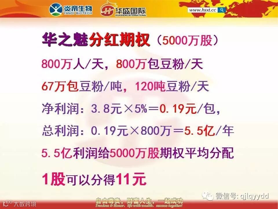 华之魅公司关于豆浆部分的利润总的分红期权是5000万股,这是公司董监事会集体决策的结果,这个数字已经固定下来将永远不变。