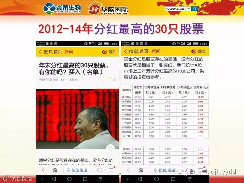 前不久我们上网查了一下A股上市企业的分红数据,看到这个表格的时候我们真的是兴奋不已。2012年到2014年分红最高的30只股票,税前分红1元钱的就可以排进前5位了,如果按照税后分红的话我们直接可以排进前3位了,要知道这些企业都已经经营了几十年了,而我们才刚刚起步两年的时间。