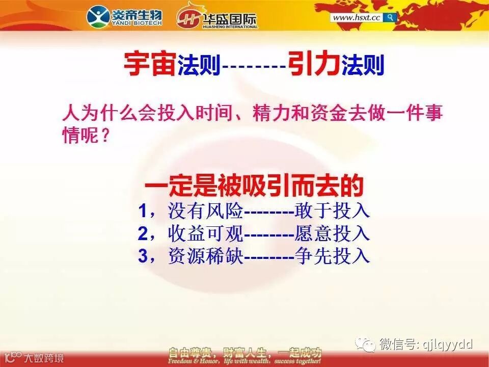 47、吸引力法则是宇宙的基本法则之一。人为什么会投入时间、精力和资金去做一件事情呢?一定是被吸引的。没有风险的事人们仅仅是敢于投入,收益可观事情人们才会真正愿意来投入,资源稀缺的机会人们必然抢着投入 。