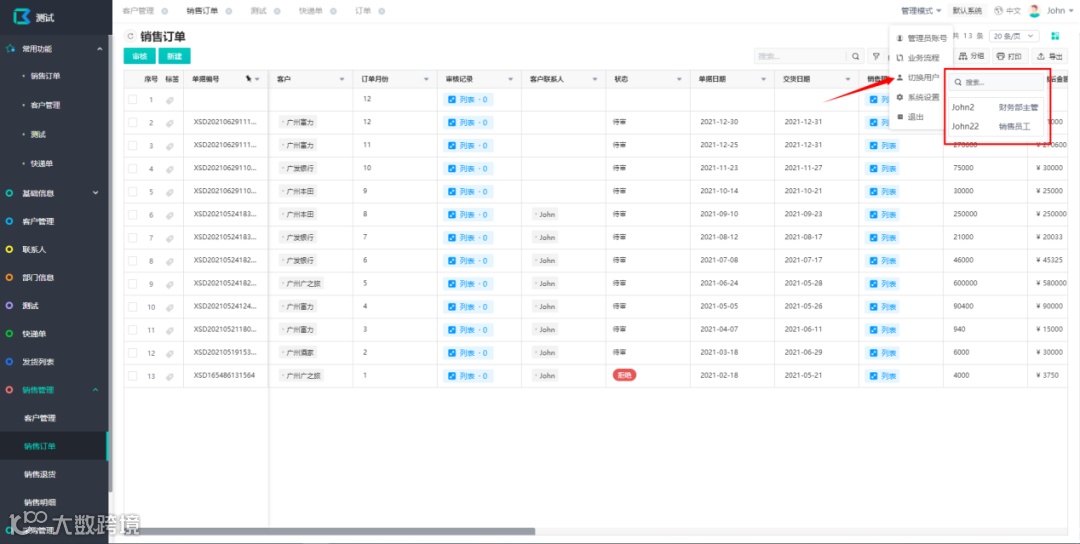 管理员能在用户端切换不同角色用户来对系统进行测试:进入管理模式后点击“切换用户”来进行用户的切换,无需退出当前帐号再登录其他账号来进行测试,点击”管理员账号”便重新进入原管理员账号,点击退出也会返回至此前的管理员账号。