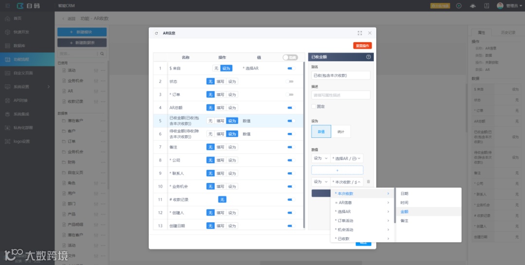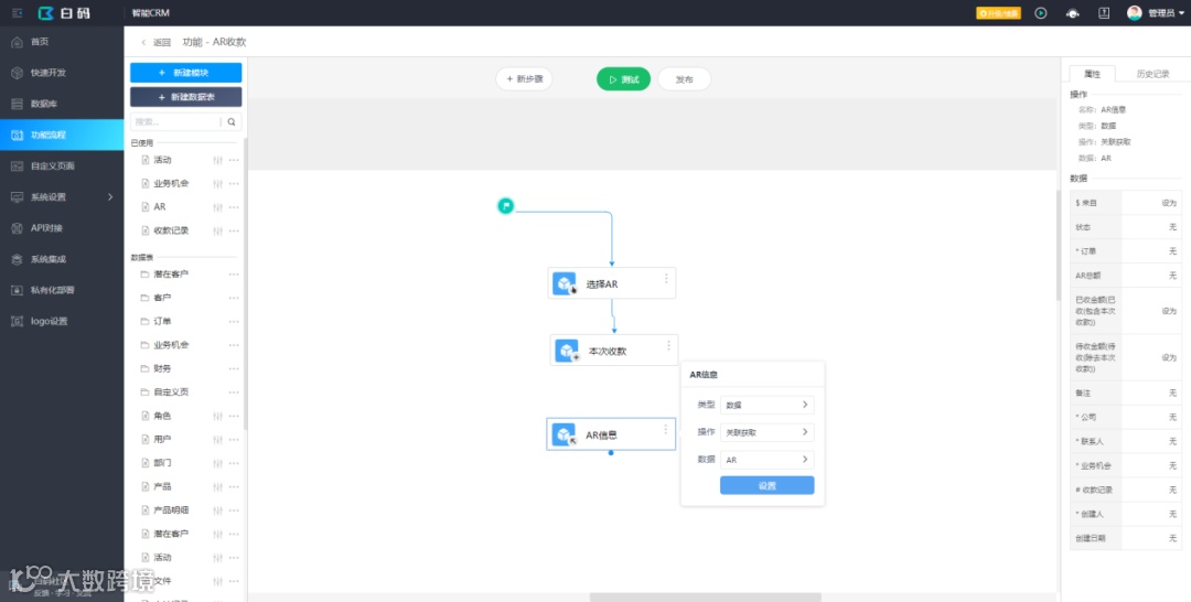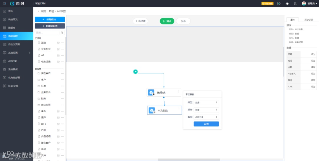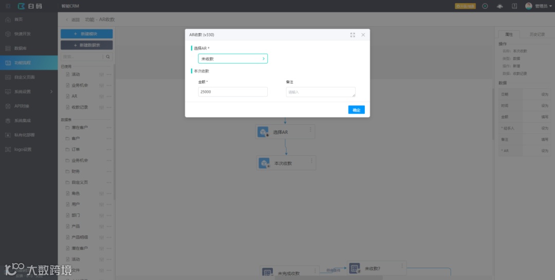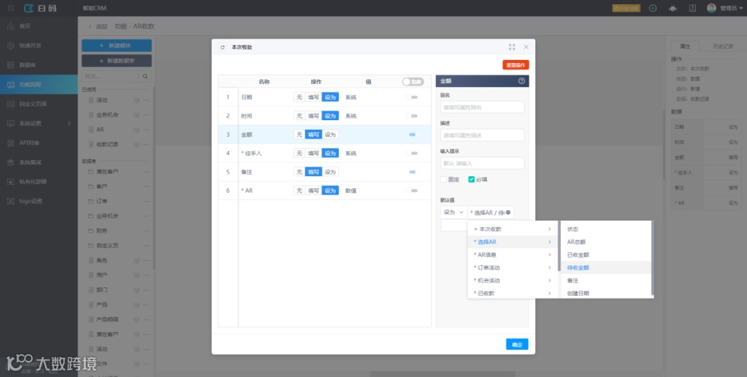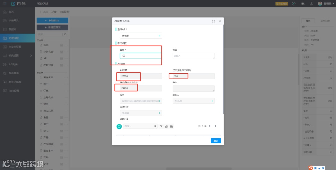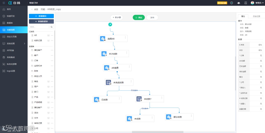 最近在做一个CRM的项目,客户想要实现一个简单的财务记账功能,记录订单应收账款及收款记录。我发现用白码可以快速实现,并且非常简单。