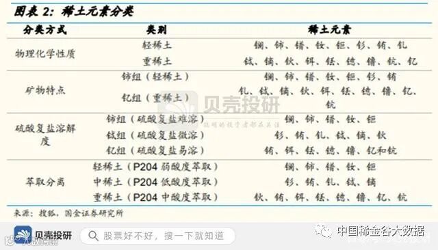 稀土通常分为轻稀土和重稀土两类。详细划分,按物理化学性质分为轻稀土和重稀土;按矿物特点分为铈组和钇组;按硫酸复盐溶解度分为铈组(硫酸复盐难溶)、铽组(硫酸复盐微溶)和钇组(硫酸复盐易溶);按萃取分离分为轻稀土(P204弱酸度萃取)、中稀土(P204低酸度萃取)和重稀土(P204中酸度萃取)。