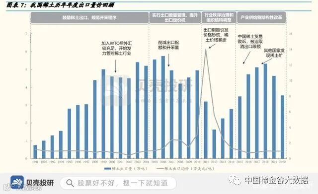总体来看,1985年-2004年为稀土产能盲目扩张阶段,二十年间出口量提升593%,而价格下跌21%;2005年-2010年为出口管控阶段,2010年稀土年出口量较2005年下降0.6万吨/年,出口均价较2005年提升了210%;2011年-2014为行业整治阶段,强制管控导致稀土价格暴涨带来更严重的走私;2015年至今为稀土供需缺口扩大阶段,2020年出口量同比下降23%,2018-2020年出口价平稳保持在1万美元/吨。