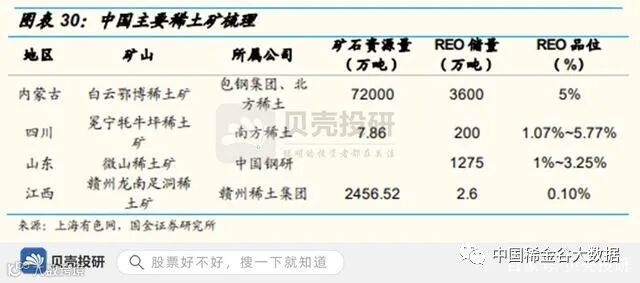 中国主要轻稀土矿:白云鄂博稀土矿、四川冕宁稀土矿和山东微山稀土矿;主要重稀土矿:南方七省稀土矿。(国金证券)