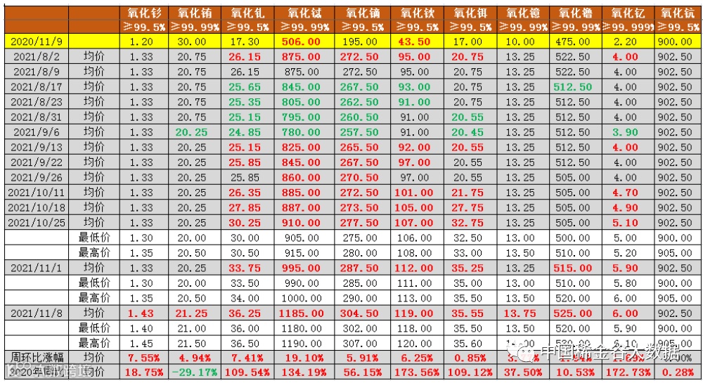 与2020年11月9日挂牌价同比分析,氧化铕同比下降(降幅32.5%→29.2%,降幅与上期相比,首次出现收窄),其它10种氧化物均同比上涨。
