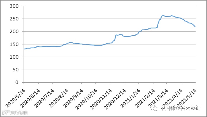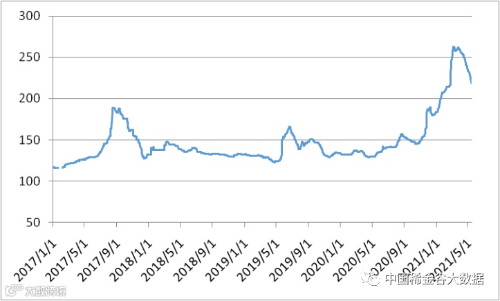 图1 镨钕系轻稀土挂牌价格走势图(201905-202105)
