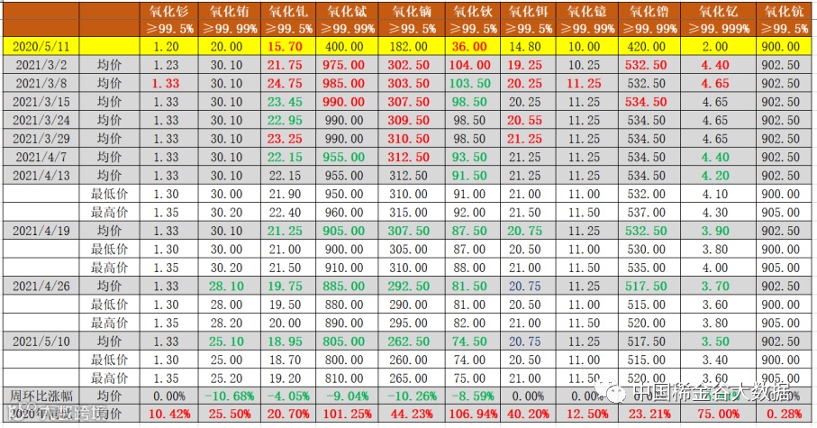 与2020年5月11日挂牌价同比分析,挂牌的11种氧化物均同比上涨。