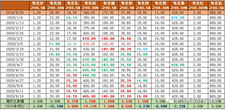 北方稀土市场营销部于5月11日发布2020年5月份轻稀土挂牌价格(表二)。