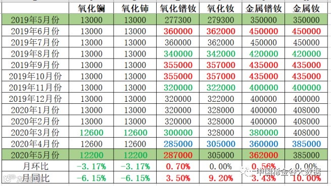 与2020年4月相比:镨钕氧化物及金属价格上涨;氧化镧、氧化铈价格下降;钕金属及其氧化物价格不变。