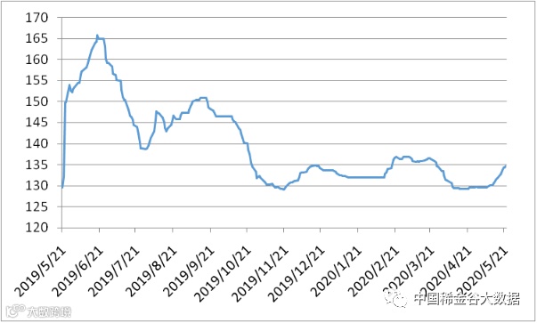 本周有五个交易日,稀土价格指数分别为132.8、133.6、134.3、134.3、134.6,稀土价格指数本周继续小幅调高。稀土价格指数年度走势及近四年同期价格走势见20190521-20200521区间稀土价格指数走势图、2017-2020年稀土价格指数同期走势图。
