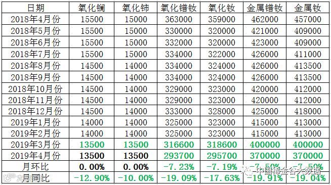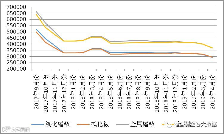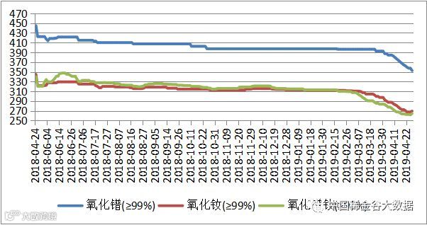 从近两年北方稀土挂牌价的走势中看出,2019年4月稀土镨钕系挂牌价格与2017年4月挂牌价格价格及其相近,镨钕系列价格可谓是到了近两年来最低的水平了。尽管北方稀土挂牌价格普遍高于市场成交价,但觉得厂商更看重的是北方稀土对稀土市场的态度,本月北方稀土挂牌价降幅是尽8个月以来最大的一次,体现了稀土市场非常惨烈的现状,这次镨钕系列挂牌价大幅下调,市场内厂商的信心再次受挫,目前金属厂均接单采购,据调研,金属厂迫于生产成本的压力,目前已有减产停产现象,预计后市价格还将下滑。
