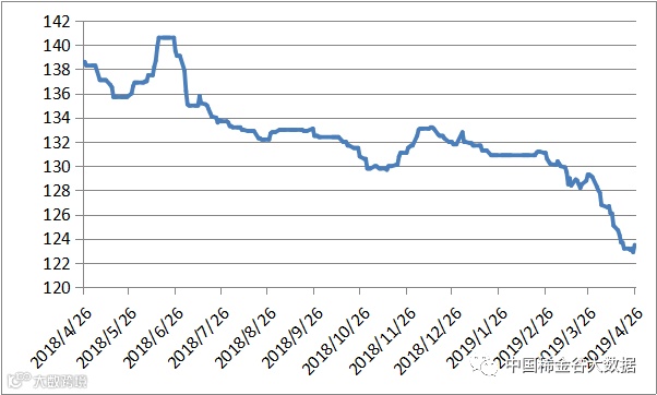 本周有五个交易日,稀土价格指数分别为123.2、123.1、123.2、122.9、123.5,本周价格较为平稳,小幅波动。稀土价格指数年度走势及近四年同期价格走势见20180426-20190426区间稀土价格指数走势图及2016-2019年稀土价格指数同期走势图。