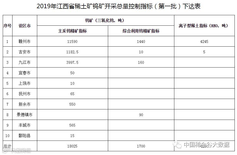 2019年3月28日江西省自然资源厅发文下达《2019年第一批稀土矿钨矿开采总量控制指标的通知》,主要指标额如下表: