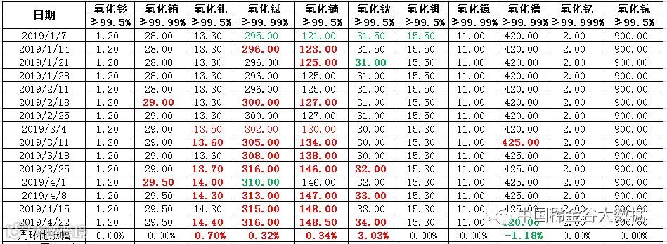 与上次发布(4月15日)相比,氧化铽、氧化镝、氧化钆及氧化钬价格上调,氧化镥价格下调,其他产品价格维持上期不变。