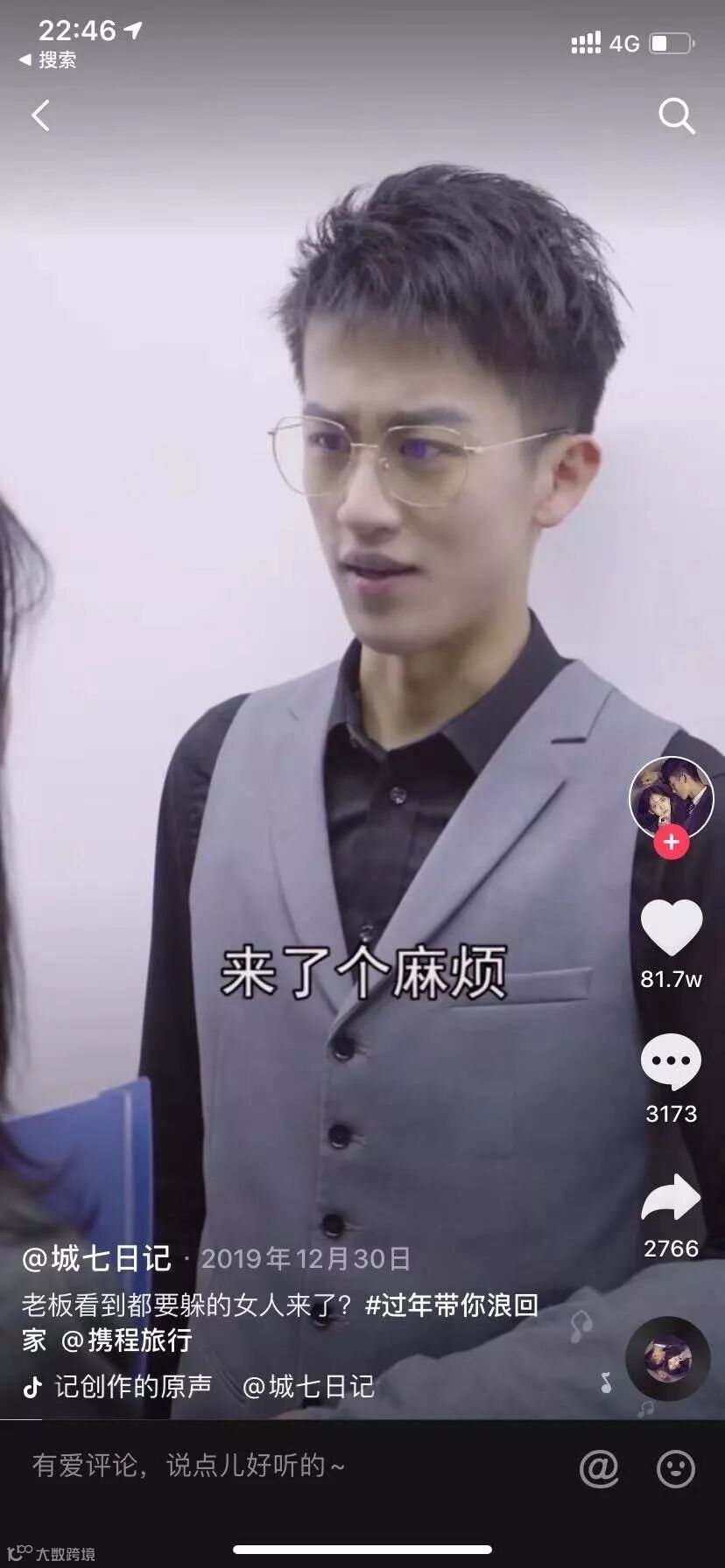 二等奖获奖作品之一,@城七日记以《老板看到躲的女人来了》为题的短视频,以最容易引起人们共鸣的爱情为内核,正牌女友用携程订票送走以“春节订不到票”为借口,前来粘着自己男友的第三者,动动手指打开携程旅行,几秒钟的时间轻轻松松订上票把小三送走,这种让人松一口气的和平式解决问题的方式,给用户带来快意的同时另类凸显携程旅行订票的价值所在。
