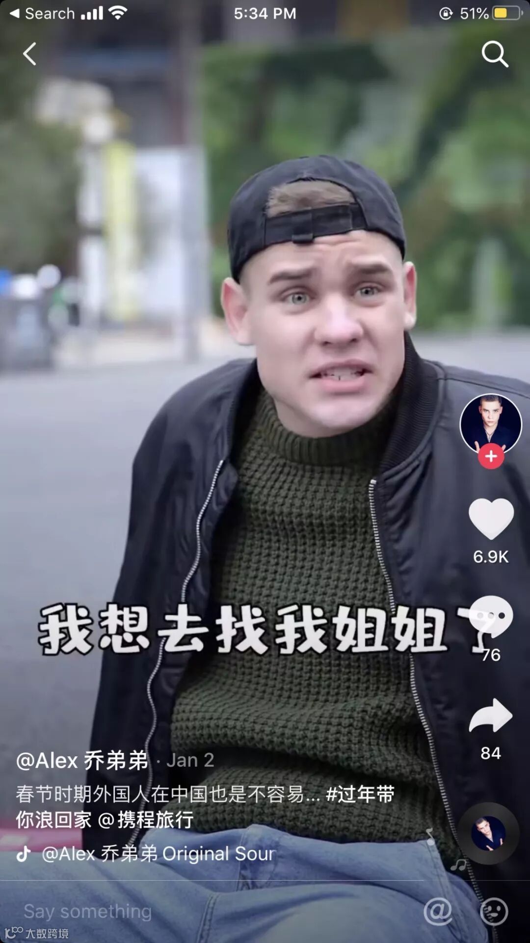 三等奖的作品之一,@ Alex乔弟弟创作的《春节时期外国人在中国也是不容易》另辟蹊径,从外国人的角度讲述春运抢票的困难,由一个大家较为陌生的异国人的视角凸显春运出行的困难,借此衬托携程旅行App抢票的便利。这时候在短视频片末出现的携程旅行App在外国人眼里如同月光宝盒,升华了产品想要凸显的“快速、便利”的功能。