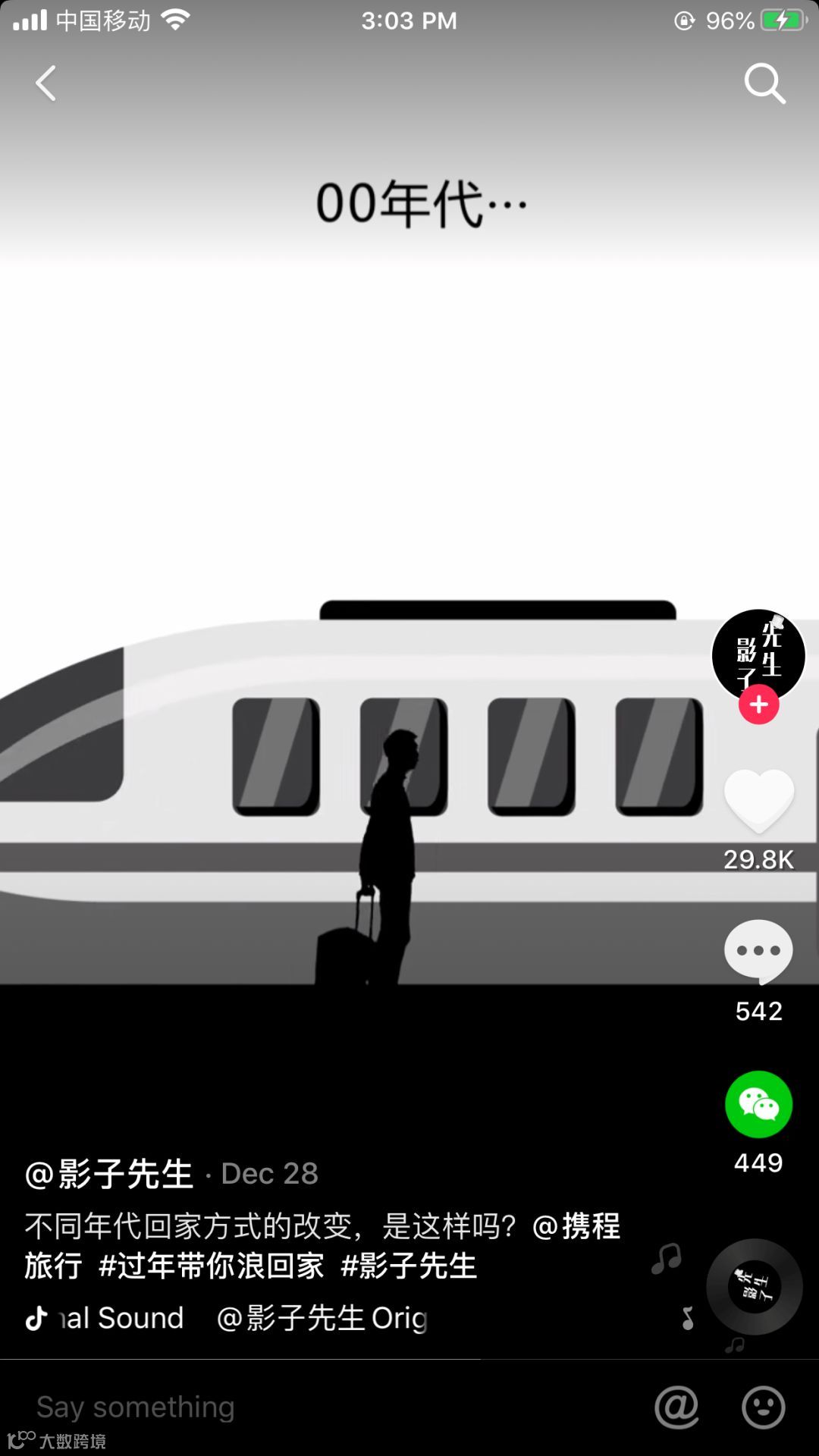 抖音的用户从70年代生到00年代生不等,年龄的广域与携程旅行的出行用户的年龄高密度重合。短视频作品的高点播量的基础之一则是倚赖于内容覆盖的用户之广,而这条@影子先生创作的《不同年代回家方式的改变,是这样吗?》从不同的年代讲述出行的方式,从消费者熟悉的生活领域出发,以追忆的方式引起共情,最后以携程旅行订票高铁作为最后的作品落脚点,完成品牌内涵叙述。