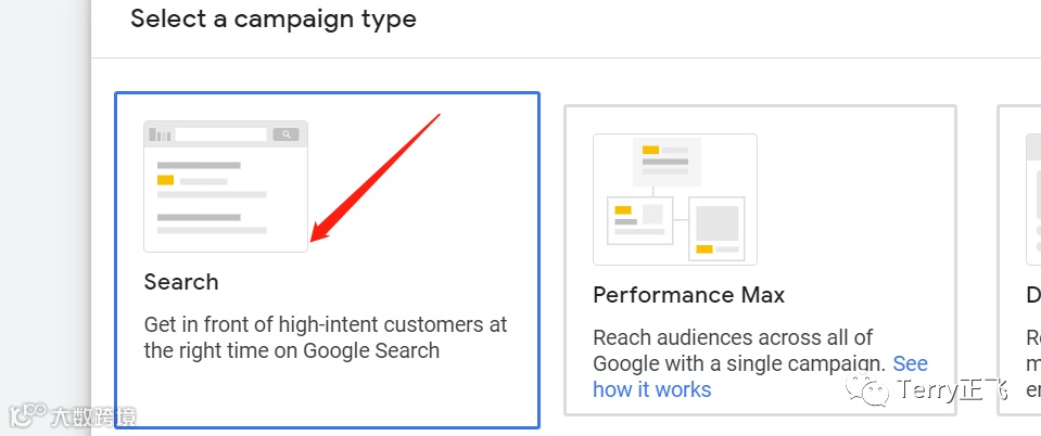 接着广告类型,就选 search,就是 搜索广告 就ok: