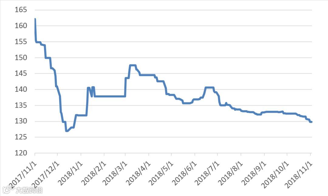 本周有五个交易日,稀土价格指数前三天为130.6、后两天为129.8,自今年7月18日跌破135点后,指数一直呈单幅下降趋势,直到本周四11月1日,跌破130点。历时将近4个月,稀土价格指数下降5点,这表时稀土市场处于不煴不火状态。近一年走势见20171101-20181102区间稀土价格指数走势图。对比2016及2017年同期,2017年价格指数呈快速上涨趋势,达到188.9点,后开始出现下降。见图2016-2018年稀土价格指数同期走势图。