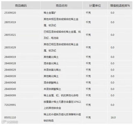 稀土相关产品出口退税率一览 稀土永磁退税16%