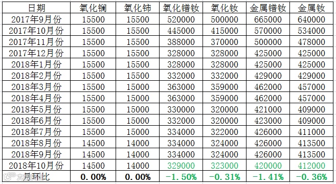 表二 轻稀土系列2017年9月-2018年10月份挂牌价格 元/吨