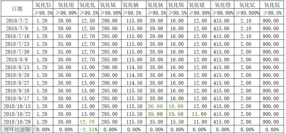表一 中重稀土氧化物2018年7-10月挂牌价格 万元/吨