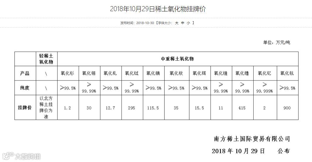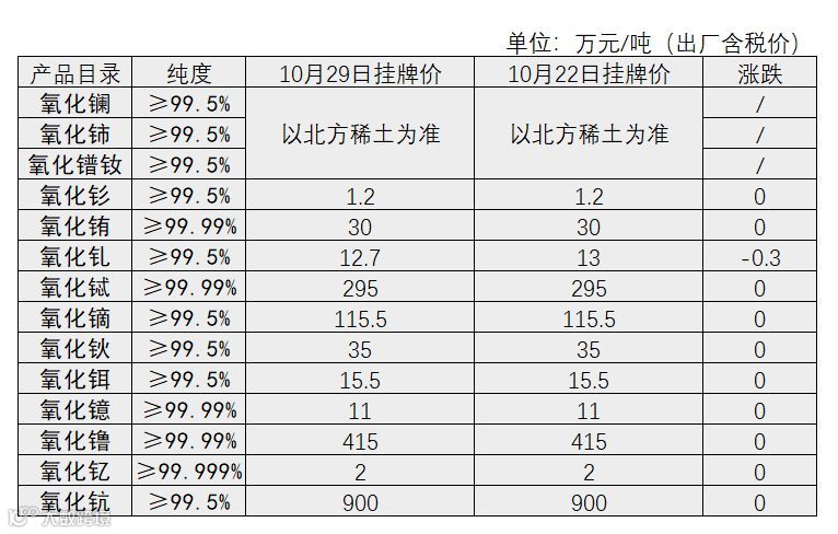 南方稀土公布本周10.29日挂牌价,与上次挂牌相比,