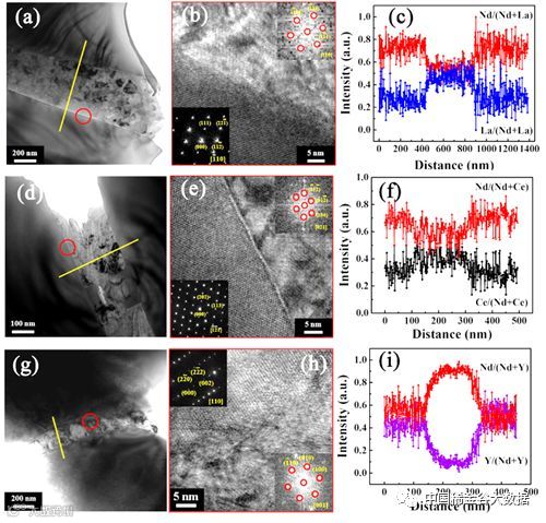 图1 不同高丰度稀土元素(La、Ce、Y)取代合金TEM微观结构及界面元素分布