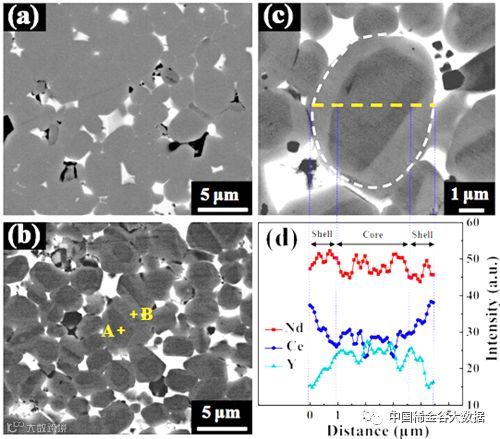 基于对该冶金行为特征及磁体反磁化机理的认识,研究人员进一步提出了Y在主相内部偏聚的结构设计思路,并获得了Y偏聚于主相晶粒核心的核壳结构,如图2所示,晶粒表层的较低的Y含量使得主相晶粒具有更高各向异性场的壳层区域,能够有效抑制晶粒表面的反磁化形核过程,增强磁体的矫顽力。进一步通过合理设计晶界成分,利用晶界相区域的溶解析出作用,解决由于晶粒生长及稀土钇元素强烈的迁移偏聚行为造成的晶粒黏连、晶界相缺失及偏聚的难题,成功实现了连续均匀的晶界相对核壳结构硬磁相的包覆,有效增强了晶粒间的磁隔离效应,使得高丰度钇混合稀土磁体表现出较高的室温矫顽力及优异的耐温特性,在Y替代Nd40%之内均可获得最大磁能积大于40MGOe的磁性能,Y替代15%Nd获得矫顽力大于17kOe的磁性能,综合性能优于Ce取代磁体。该研究结合主相结构调控及晶界增强技术,解决了高丰度稀土磁体成相难及结构不均匀的问题。