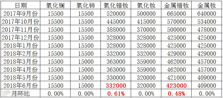 表二 轻稀土系列2017年9月-2018年6月份挂牌价格 元/吨