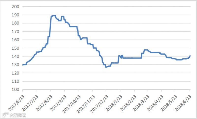 本周五个交易日稀土指数分别为137.5、138.2、138.7、139.8、140.6,本周稀土价格指数在上周五基础之上,持续小幅上涨。稀土价格指数近一年走势见20170613-20180615区间稀土价格指数走势图。对比2016及2017年同期,价格指数同比上涨,见图2016-2018年稀土价格指数同期走势图。