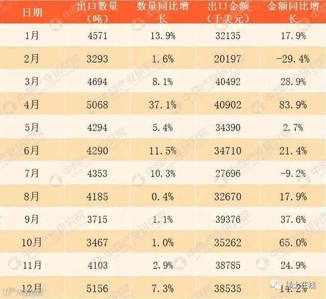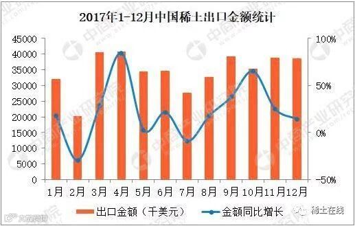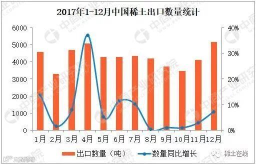 据中商产业研究院发布的《2018-2023年中国稀土市场前景及投资机会研究报告》数据统计显示,2017年12月中国出口稀土4103吨,同比增长2.9%;1-12月中国出口稀土51199吨,与去年同期相比增长9.7%。