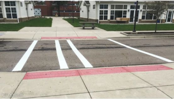 俄亥俄州盲人学校门口的人行横道,表面看起来像是可以在任何十字路口都可以找到的那种人行道,但其边缘处的白色条纹是用“智能涂料”制成的——如果一个视力受损的学生在使用带有新型智能探头的手杖穿过人行横道,手杖会在接触到线条时发生振动。