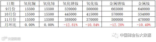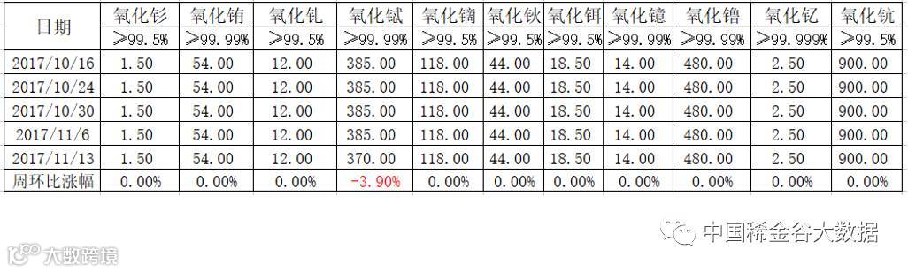 11月13日,南方稀土集团发布本周中重单一稀土氧化物挂牌价格(表一),本周发布的指导价除氧化铽下跌外,其它氧化物价格连续六周均未发生变化。氧化铽价格由上周385万元/吨下调至370万元/吨,降价15万元/吨,下跌幅度3.9%。