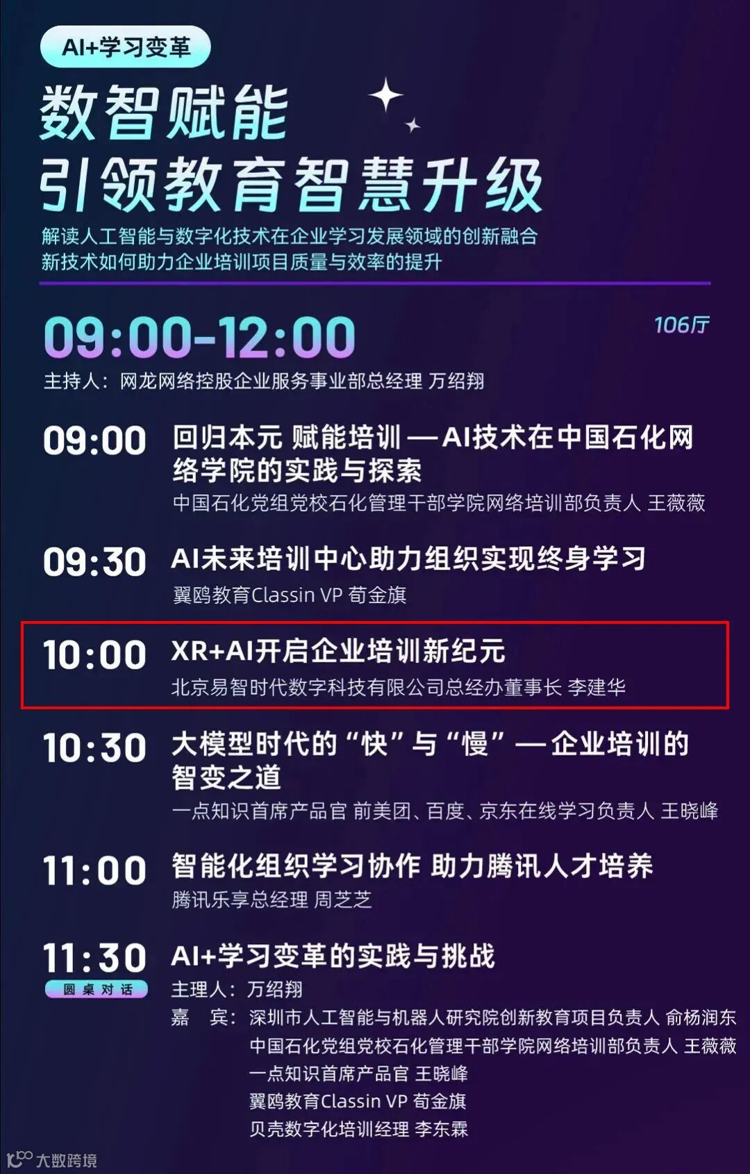 在即将到来的大会中,易智时代李建华将深入剖析XR(包括VR、AR、MR等)与AI技术相结合为企业培训带来的新变革,通过分享易智时代在XR和AI领域的最新研发成果及实践案例,展示如何通过前沿技术打破传统培训的时空限制,提供沉浸式、交互式的培训体验,从而提升培训效率与效果,为企业培养更多适应未来需求的高素质人才。