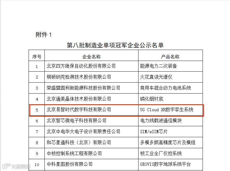 近日,国家工业和信息化部公布了“第八批制造业单项冠军企业”公示名单,北京易智时代数字科技有限公司(简称易智时代)以5G cloud XR 数字孪生系统成功入选,再次揽获一项国家级荣誉。