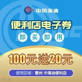 活动内容:即日起,通过现场扫码/中经油马APP,购买惠州中海油(便利店)100元电子现金券,赠送20元,一次性到账,总面值为120元。本电子券可即买即用(除店内烟、特价商品外,标价商品均可购买),不设购买数量,限量20000张。