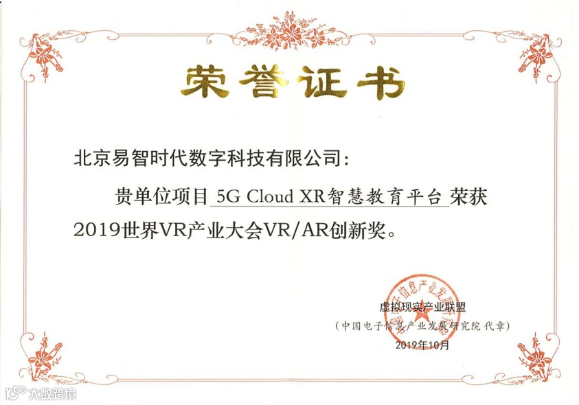 易智时代在2019、2020连续两年承办世界VR产业大会分论坛,并蝉联中国VR50强企业,公司旗下核心产品“5G Cloud XR智慧教育平台”荣获2019世界VR产业大会VR/AR创新奖。