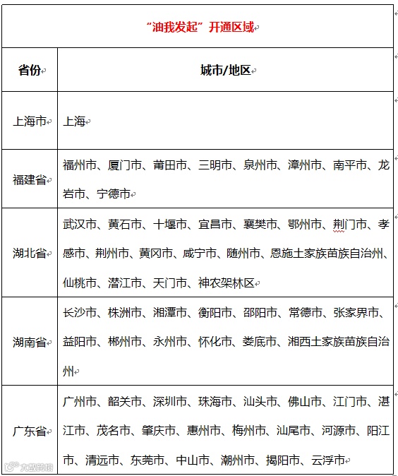 “油我发起”目前已经开通了上海、福建、湖北、湖南、广东五个省,更多省市正在开通中,敬请期待!