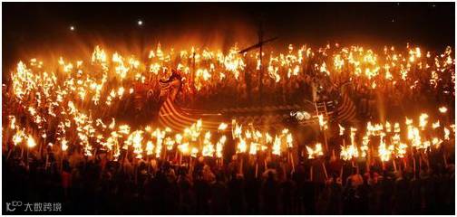 时间:1月的最后一个周二 地点:苏格兰勒威克镇(Lerwick) 经过:圣火节Up Helly-Aa中的“Helly-Aa”意为最后的圣洁之日,仪式由打扮成维京时代的英雄Guizer Jarl的人引导,人们举着火把在大街小巷游行,最后把火把丢到一艘维京龙头战舰上看着它烧成灰烬。 原因:为了庆祝冬天的结束,而“Up Helly-Aa”也被认为是挪威语中的“神圣之日的尽头”