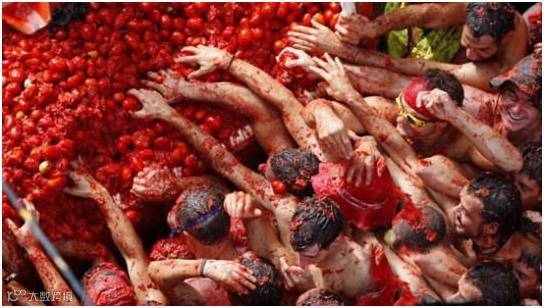 时间:8月的最后一个周三 地点:西班牙布尼奥尔镇 经过:该小镇从1945年就开始有这个传统,狭小的街道上挤满了2万人,互相扔5.4万千克的西红柿。 原因:只是因为好玩而已!