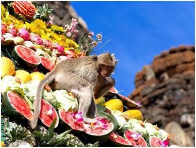 时间:11月的最后一个周末 地点:泰国华富里 经过:届时人们会精心准备好猴子喜爱的各种美食,等待着Pa Prang Sam Yot庙附近的成千上万只猴子下来享用。 原因:带动旅游经济,于1989年由当地商人发起。