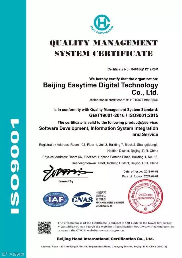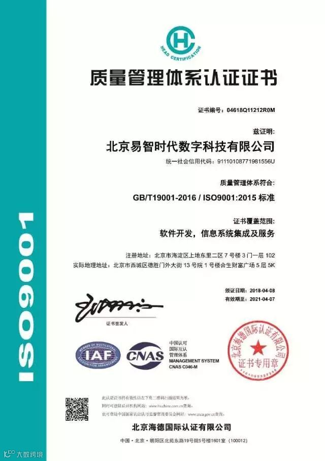 ISO9001不仅为质量管理体系,也为总体管理体系设立了标准,它的到来也证实了易智时代一直具备全方位满足客户需求和提供适用法规要求产品的能力。