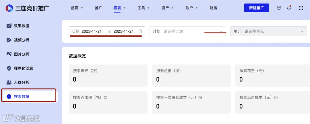 在后台主界面,找到并点击顶部的 “报表” 导航栏,进入报表分析中心。选择搜索广告报表:
