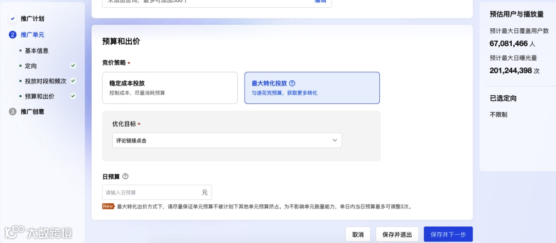 最大转化投放下,不建议使用过窄的人群定向,过窄的人群包有可能导致成本上浮;