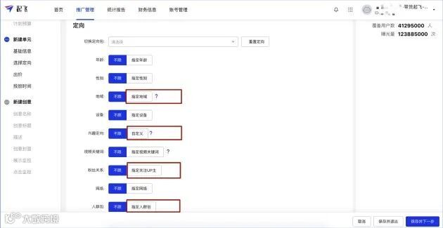 单元设置只要是基于人群定向,可以设置年龄、地域、兴趣爱好、指定同行up主下粉丝、基于关键词内容标签人群包设置等等。人群定向设置决定品牌主视频将会推送给特定目标人群。